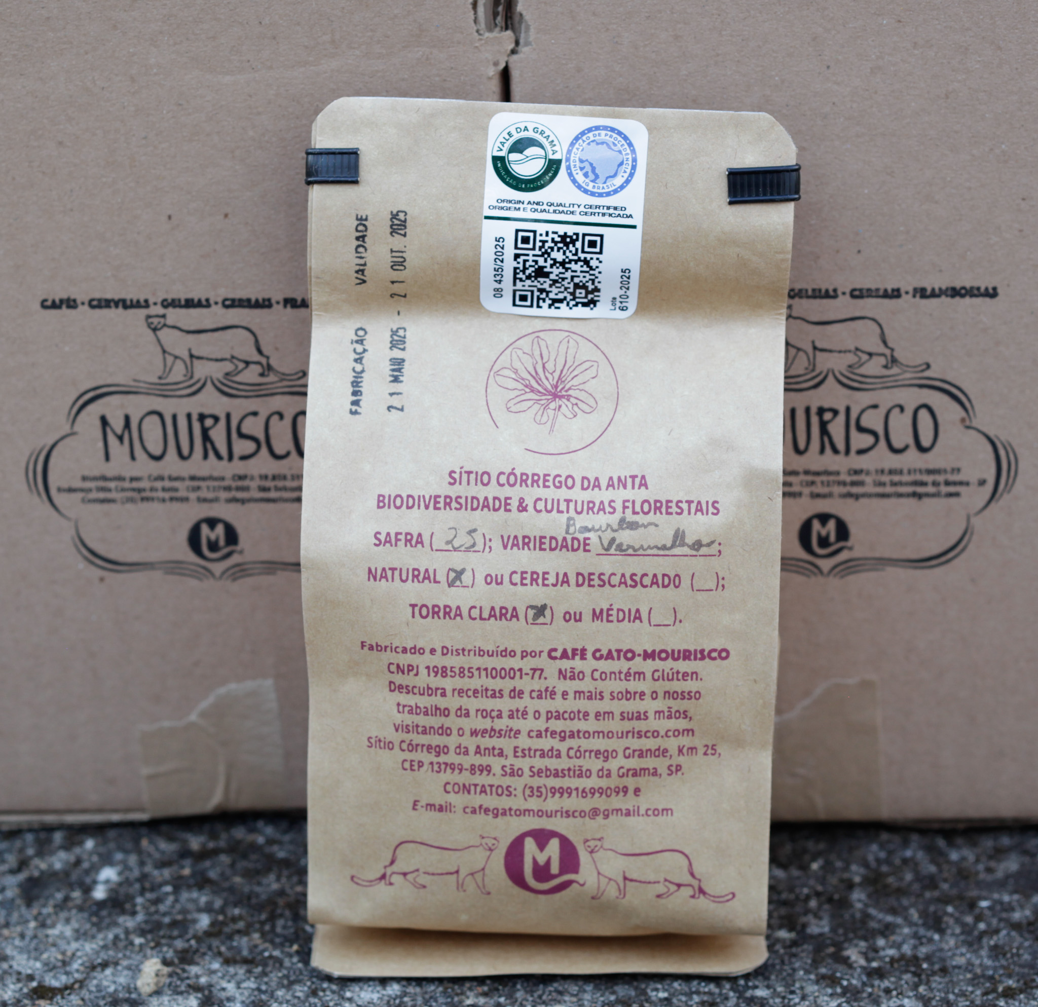 A Café Gato-Mourisco oferece a você  250g de grãos da variedade bourbon vermelho do Sítio Córrego da Anta. Safra 2025, lote cereja descascado.